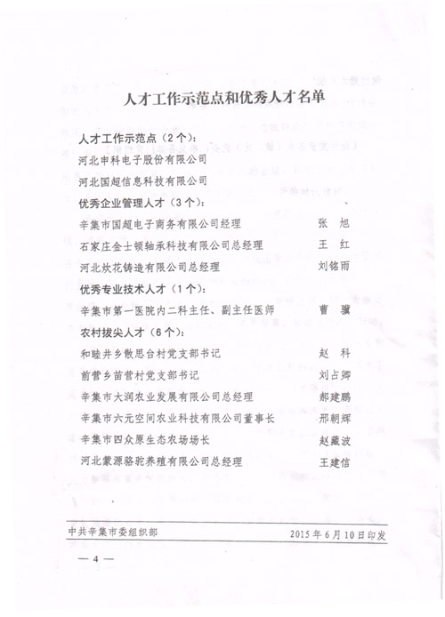 2015年6月10日,我公司被中共辛集市委組織部確定為“人才工作示范點”,公司子公司----辛集市國超電子商務(wù)有限公司總經(jīng)理張旭被評為“優(yōu)秀企業(yè)管理人才”。