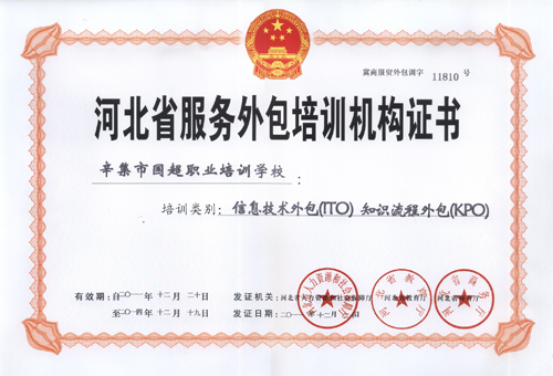 辛集市國超職業(yè)培訓(xùn)學(xué)校被評定為"河北省服務(wù)外包培訓(xùn)機(jī)構(gòu)"(證書)